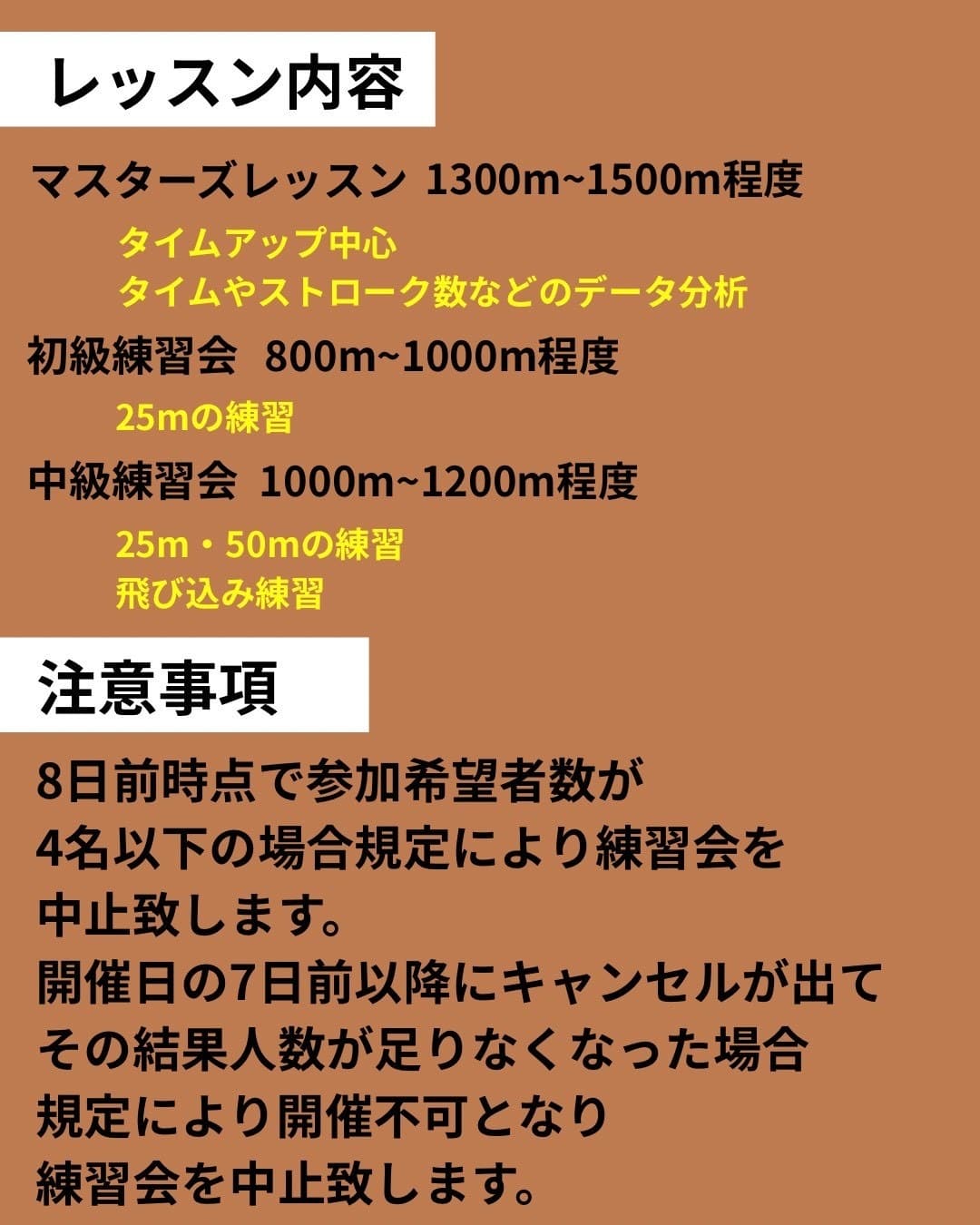 ・開催日の7日前以降にキャンセルが発生し、その結果、参加人数が規定人数に満たなくなった場合も、開催不可となり練習会を中止いたします。